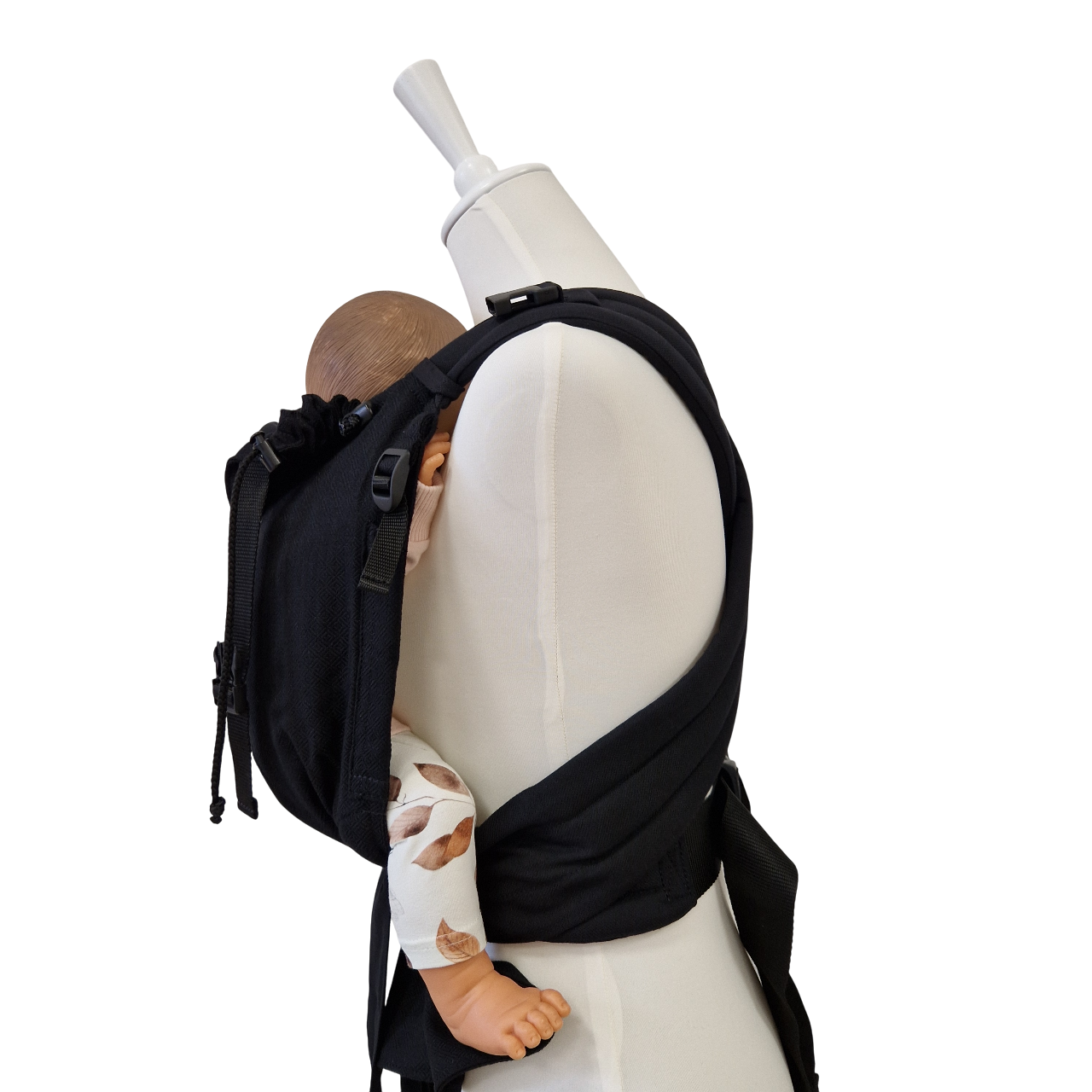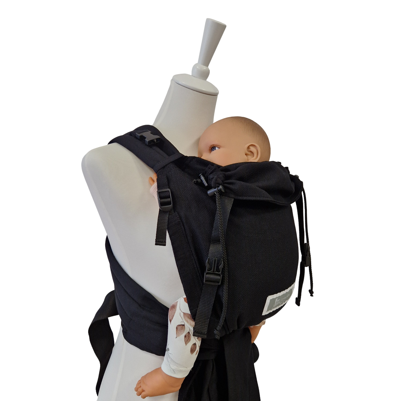 Optimal anpassbare Half-Buckle Babytrage Leo Schwarz. Tuchbeutel mit zartem Webmuster, Schulterträger/Bauchgurt einfarbig Schwarz.